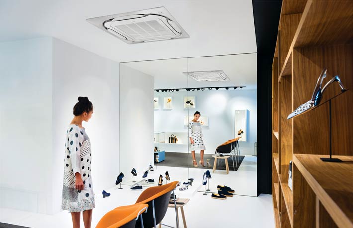 بالإضافة إلى ضمان تشغيل نظام Sky Air عند أعلى كفاءة في كل الأوقات، تقوم تقنية درجة حرارة غاز التبريد المتغيرة برفع مستوى الراحة إلى الحد الأقصى عن طريق تشكيل تدفق هواء بدرجة حرارة أعلى للمساعدة في الحفاظ على بيئة مستقرة خالية من التيارات وبالتالي إبقاء عملائك في المتجر لفترة أطول.