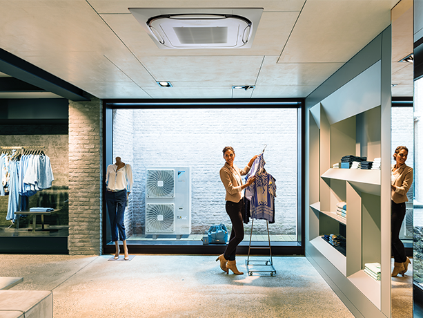 From our Sky Air series, this R-32 system linked 2 wall-mounted units and 2 round flow cassettes to distribute air throughout the store. Organised into 3 different climate zones, this heat pump system was the ideal choice to provide a comfortable climate for both customers and staff.