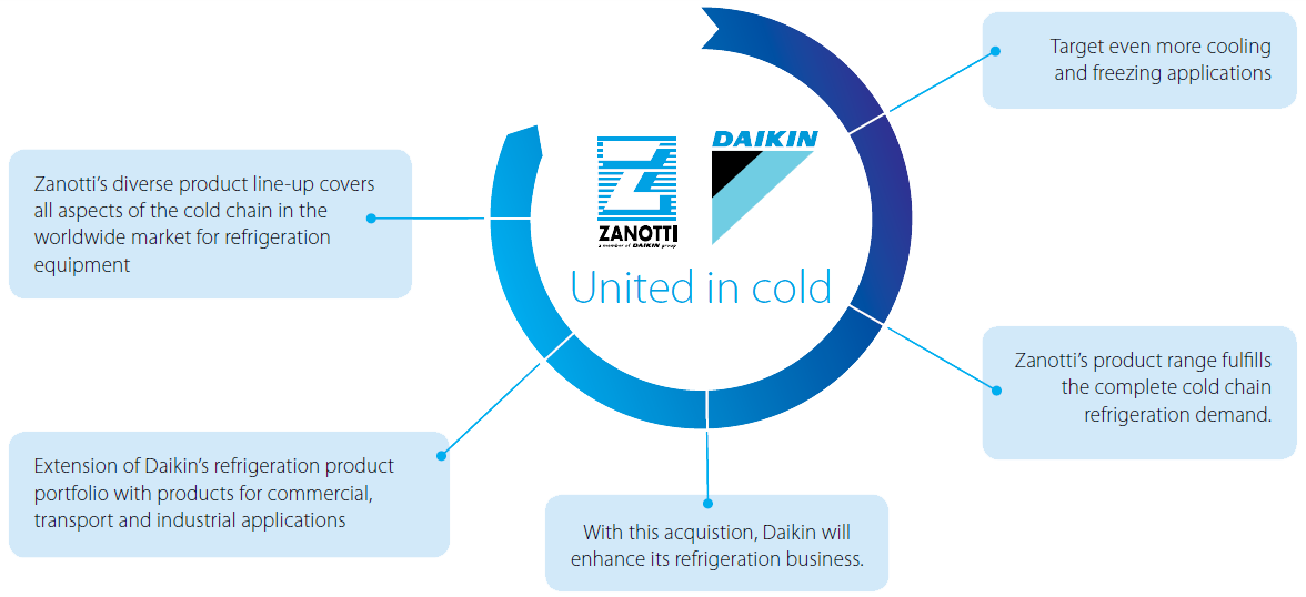 With the acquisition of Zanotti, Daikin can now provide a diverse product line up for all aspects of the cold chain that extend from those used in food production and transportation (overland shipping) to those found at retailers.