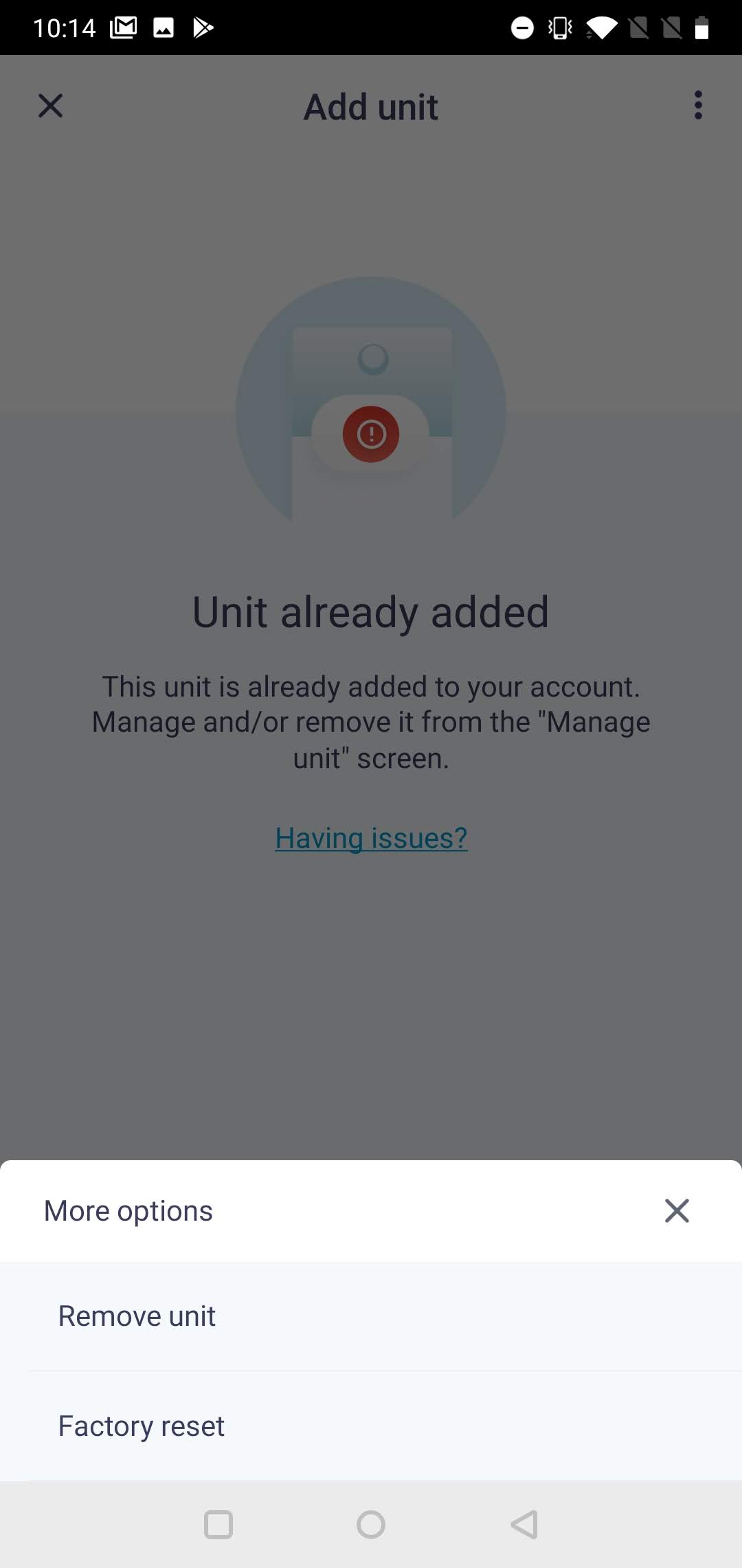 From the "Unit already added" screen, tap the three dots and disassociate the unit.