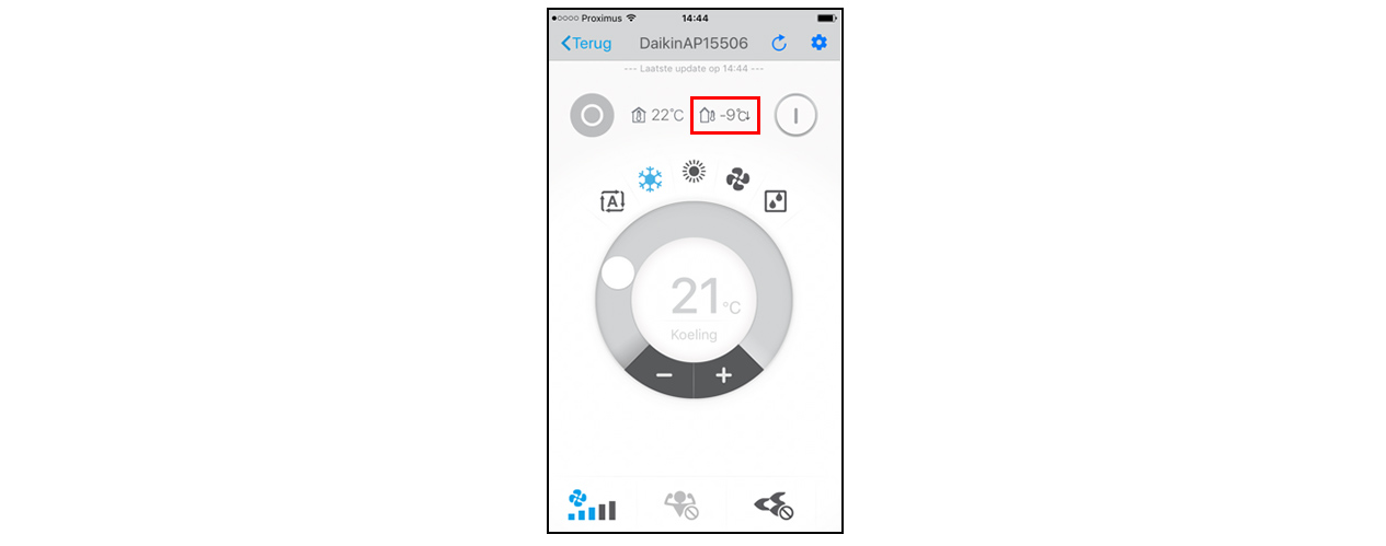 When the actual outdoor temperature is lower than the lower limit of the outdoor temperature measurement range, the application displays a down arrow next to the outdoor temperature.