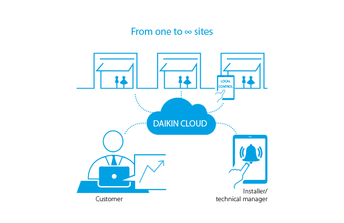 Control your building from any location. Our Daikin Cloud service can connect multiple building locations and is accessible via any web enabled device. Installers and technicians also have access to the Could so that they can remotely log in and immediately begin troubleshooting if there is ever a malfunction. The user-friendly interface makes control even easier, and the automatic energy consumption tracking helps you reduce your costs in the long-run.